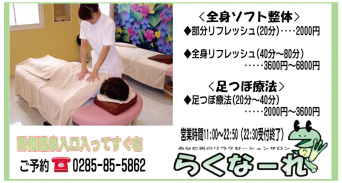 手もみの技術により、皆様のストレス解消・疲労回復のお手伝いをさせていただきます。お客様の心身にあわせた技術なので初めての方でも安心して、気軽にご利用できます。 |